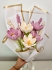 Let delicate elegance speak for you with Tulip Whispers, a bouquet that captures the calm beauty of lilac and ivory open tulips paired effortlessly with soothing lavender sticks. Thoughtfully wrapped in pristine white paper, this arrangement is as serene as it is stunning.